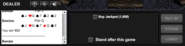 Untuk mendapat jackpot anda hanya perlu menconteng kolom yang sudah di sediakan sebelum permaian dimulai conteng kolom Buy jackpot hanya dengan Rp.1000 jika anda beruntung maka anda akan mendapat jackpot besar. Jika Bandar dan pemain mendapatkan tingkat kartu yang sama misalnya 2 pair dengan pair yang sama, maka akan draw Member akan mendapatkan bayaran